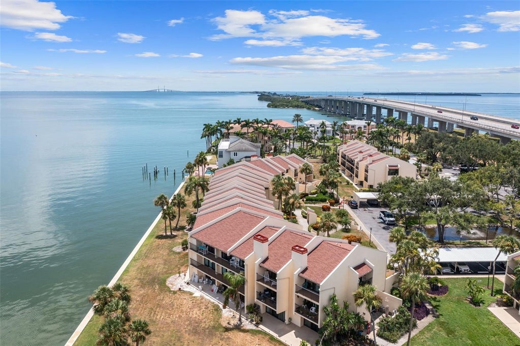 Breathtaking Tampa Bay Waterfront Living! Enjoy spectacular panoramic views of the water and the iconic Sunshine Skyway Bridge from this beautifully updated second floor condo in highly sought-after Seapointe Terrace. Impact-rated floor-to-ceiling windows and sliding glass doors in the living room and both bedrooms open to a 40-foot balcony, perfect for morning coffee, relaxing with a book, or watching unforgettable sunrises. Fully renovated in 2018, this home boasts a spacious kitchen with granite countertops, stainless steel appliances, a breakfast bar, and abundant natural light from the west-facing balcony. The open-concept living and dining area creates a seamless flow for entertaining. Wood-grain tile flooring enhances the main living spaces, while both en-suite bedrooms feature luxury vinyl plank flooring. The split floor plan provides privacy, and the guest suite includes a full-size washer and dryer. Additional conveniences include storage on the balcony for beach gear, plus community storage areas for larger items. Resort-style amenities include a heated pool, kayak launch, tennis, pickleball courts, and beautifully maintained grounds. The community has passed the Milestone Study and features fully funded structural reserves for peace of mind. Perfectly located, this condo is just minutes from I-275, offering quick access to downtown St. Petersburg and Tampa International Airport. You’re less than 15 minutes from Fort De Soto Park and the pristine Gulf beaches, and within walking distance to marinas, Maximo Park, and the Sky Beach Resort with live entertainment several nights a week. Wake up to breathtaking sunrises and end your day with the sparkling lights of the Sunshine Skyway Bridge, welcome to your dream waterfront retreat. Schedule your private showing today!